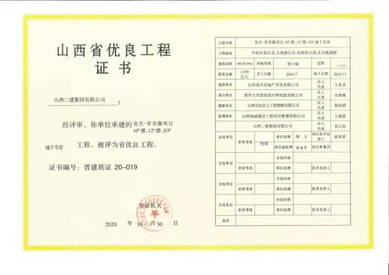 競杰?常青藤10#、12#、D3#地下車庫樓項(xiàng)目榮獲2020年山西省優(yōu)良工程獎