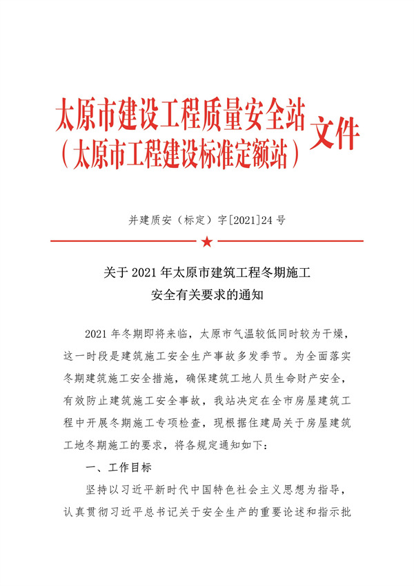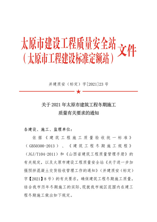 關(guān)于轉(zhuǎn)發(fā)太原市質(zhì)安站《關(guān)于2021年太原市建筑工程冬期施工質(zhì)量有關(guān)要求的通知》、《關(guān)于2021年太原市建筑工程冬期施工安全有關(guān)要求的通知》的通知