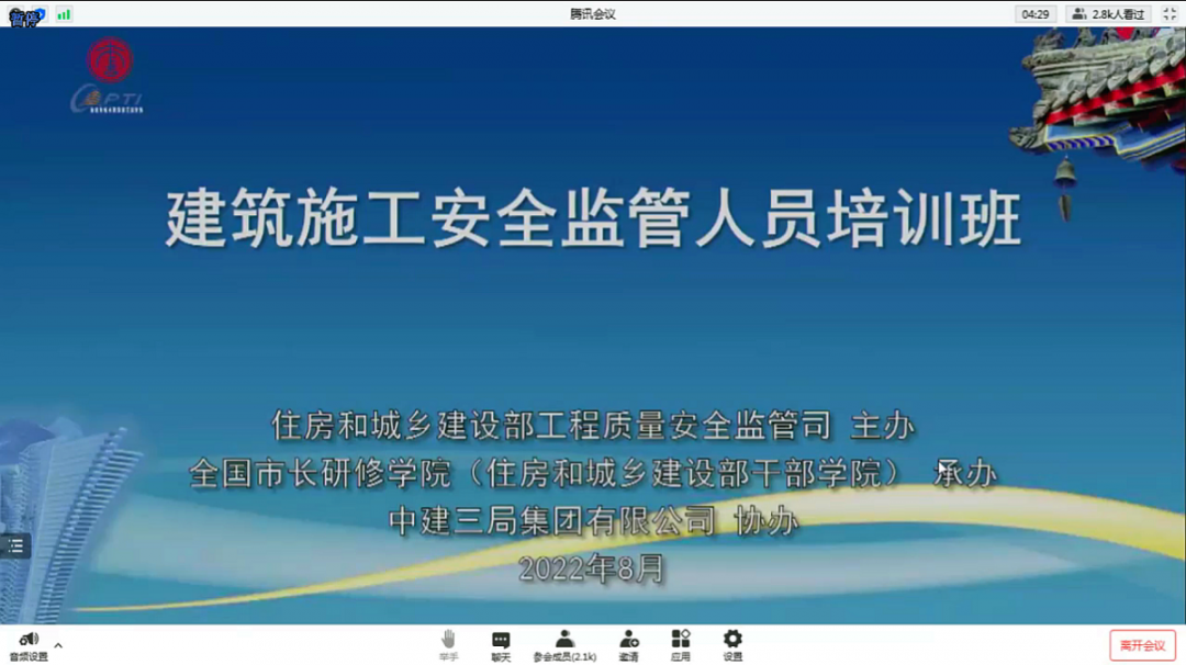 3、8月23、24日,國家住房和城鄉(xiāng)建設(shè)部工程質(zhì)量安全監(jiān)管司發(fā)起舉辦“建筑施工安全監(jiān)管人員培訓(xùn)班”, 公司組織各事業(yè)部、各項(xiàng)目監(jiān)理部,運(yùn)用網(wǎng)絡(luò)平臺,在線上對培訓(xùn)內(nèi)容進(jìn)行了收聽收看。