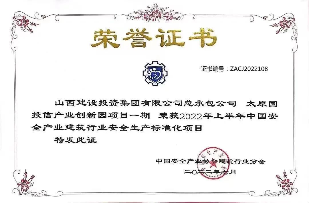 2、近日,公司監(jiān)理的太原國投信產(chǎn)業(yè)創(chuàng)新園項(xiàng)目一期工程,榮獲2022年上半年中國安全產(chǎn)業(yè)建筑行業(yè)安全生產(chǎn)標(biāo)準(zhǔn)化項(xiàng)目。