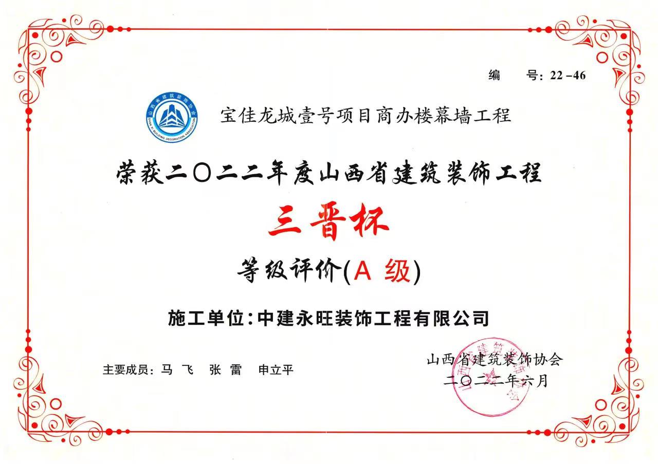 2、公司監(jiān)理的寶佳龍城壹號(hào)項(xiàng)目商辦樓幕墻工程,榮獲2022年度山西省建筑裝飾工程“三晉杯”等級(jí)評(píng)價(jià)A級(jí)。