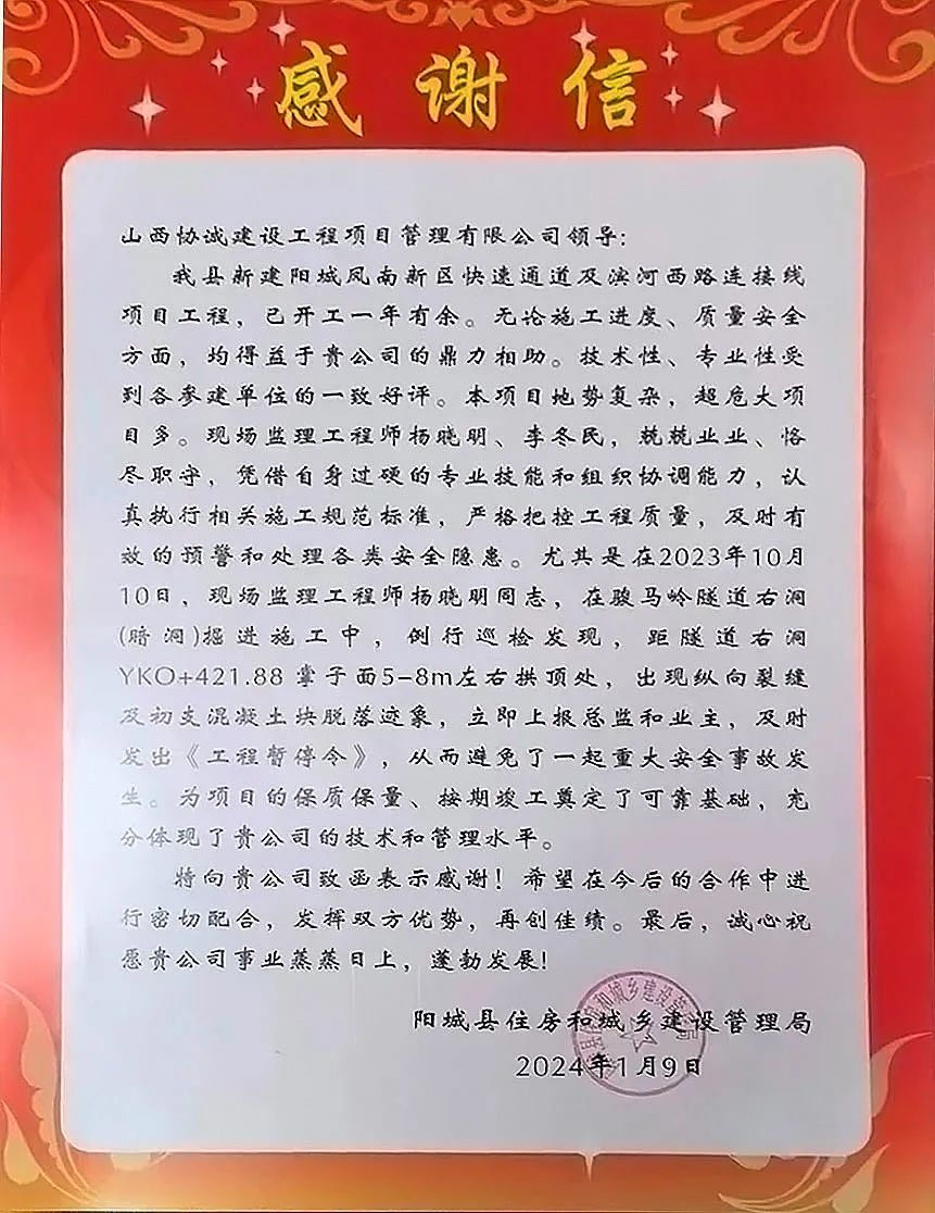 5、誠(chéng)信樹豐碑,捷報(bào)迎新春。龍年新春來(lái)臨之前,公司捷報(bào)頻傳,其中,國(guó)營(yíng)第八二五庫(kù)項(xiàng)目管理部授予公司“突出貢獻(xiàn)獎(jiǎng)”;公司被山西國(guó)金電力有限公司評(píng)為“優(yōu)秀監(jiān)理單位”;金科地產(chǎn)華北大區(qū)授予公司“優(yōu)秀合作單位”;公司監(jiān)理的太原國(guó)投信息產(chǎn)業(yè)創(chuàng)新園項(xiàng)目一期2#、3#、4#樓被太原市建設(shè)工程質(zhì)量安全站評(píng)定為2023年太原市“結(jié)構(gòu)優(yōu)質(zhì)工程”;公司被招商仁和太原置業(yè)有限公司評(píng)為2023年度“優(yōu)秀合作伙伴”。特別是公司監(jiān)理的陽(yáng)城鳳南新區(qū)快速通道及濱河西路連接線工程,由于該項(xiàng)目監(jiān)理部員工的盡心盡責(zé),對(duì)安全隱患及時(shí)有效的預(yù)警和處置,公司受到陽(yáng)城縣住建局的致函感謝。