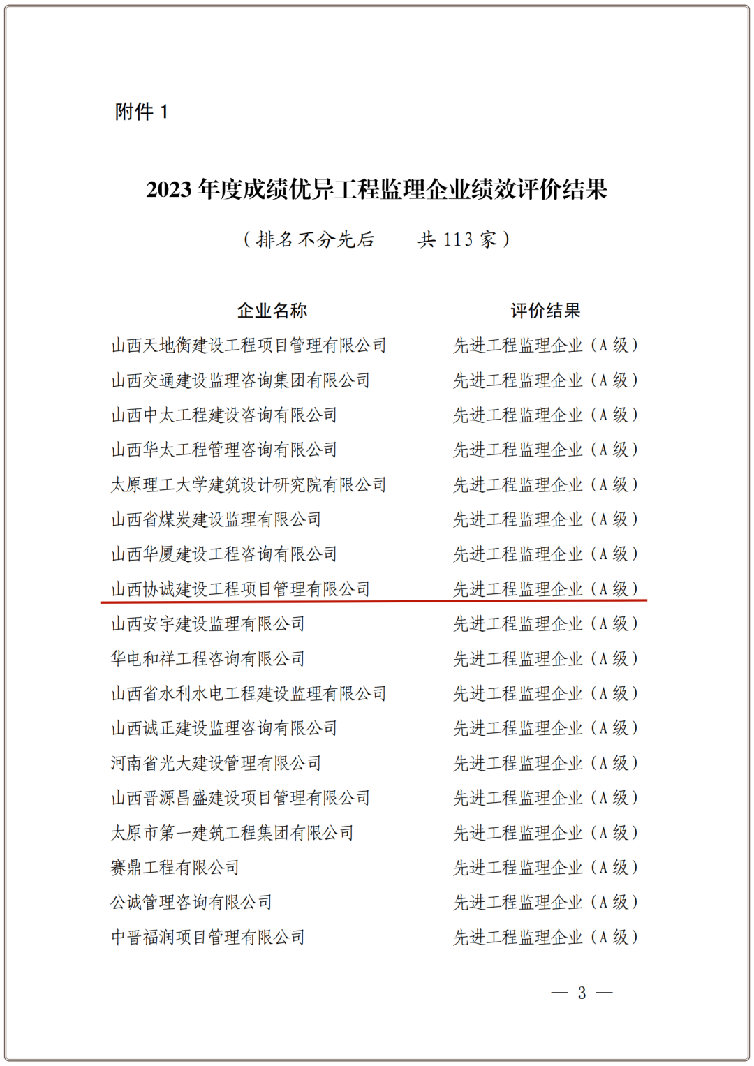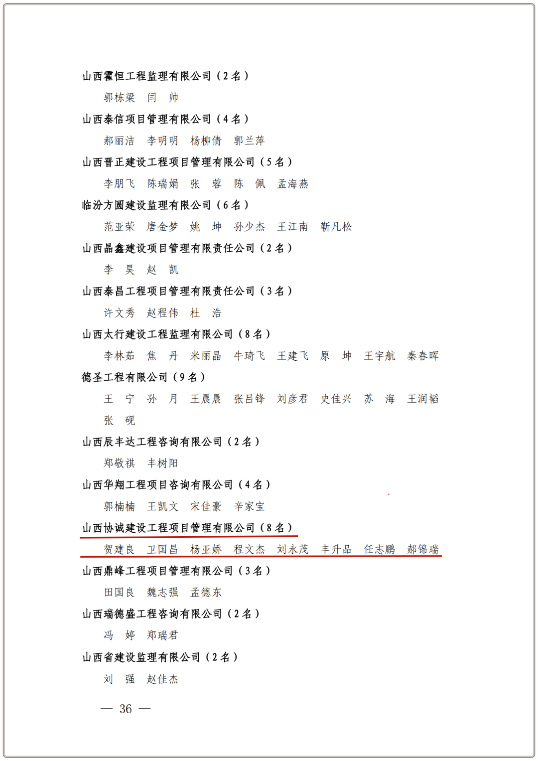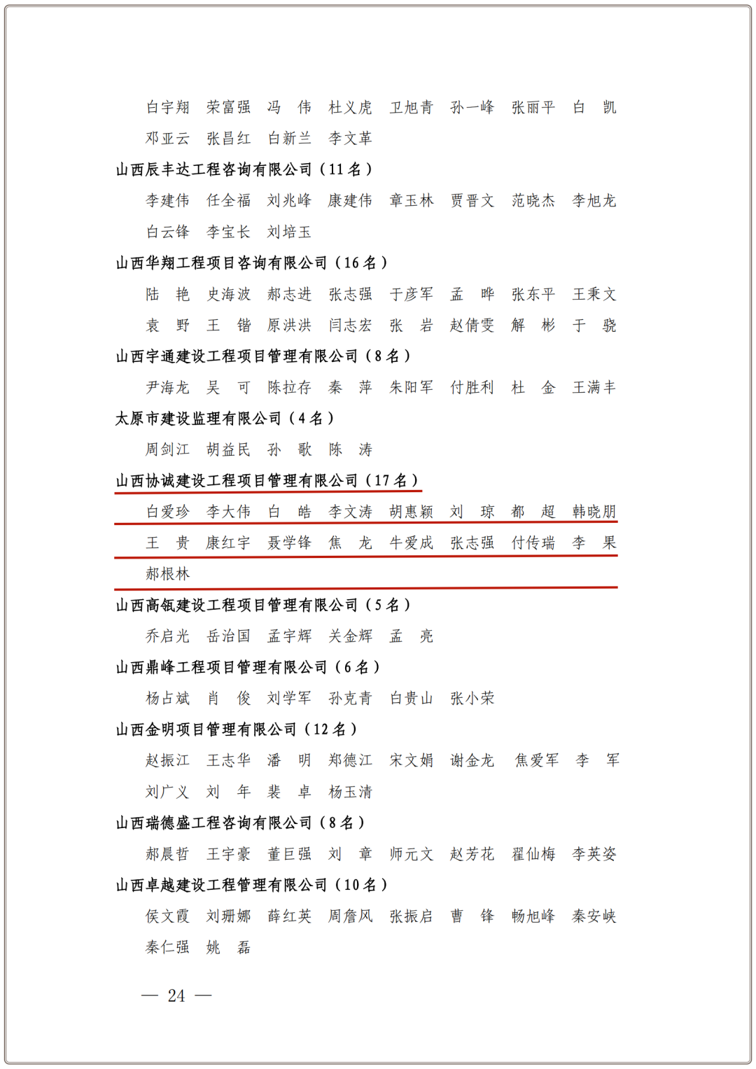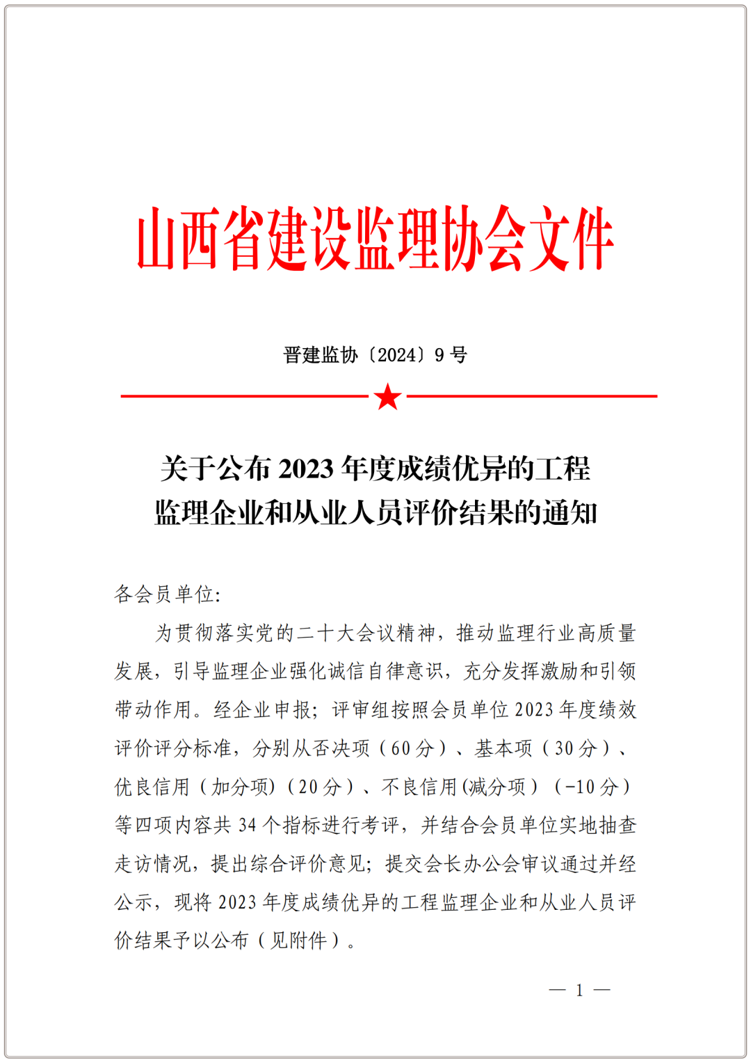 3、近日,山西省建設(shè)監(jiān)理協(xié)會以晉建監(jiān)協(xié)〔2024〕9號文件公布了2023年度成績優(yōu)異的工程監(jiān)理企業(yè)和從業(yè)人員評價結(jié)果,我公司被評為先進(jìn)工程監(jiān)理企業(yè)(A級);公司22人被評為成績優(yōu)異總監(jiān)理工程師;17人被評為成績優(yōu)異專業(yè)監(jiān)理工程師;8人被評為成績優(yōu)異監(jiān)理員;韓華被評為成績優(yōu)異協(xié)會工作者。