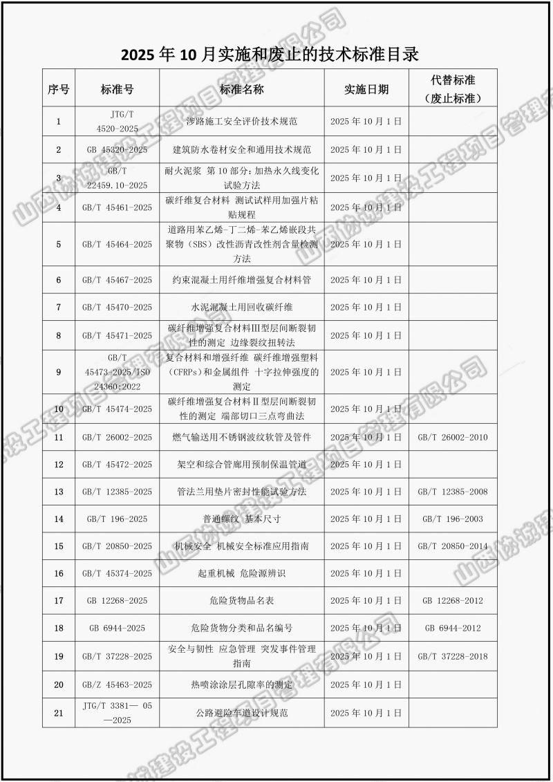 2025年10月實(shí)施和廢止的法律法規(guī)、標(biāo)準(zhǔn)規(guī)范目錄如下,請(qǐng)大家根據(jù)工程實(shí)際需要積極學(xué)習(xí)落實(shí)相關(guān)新標(biāo)準(zhǔn)。