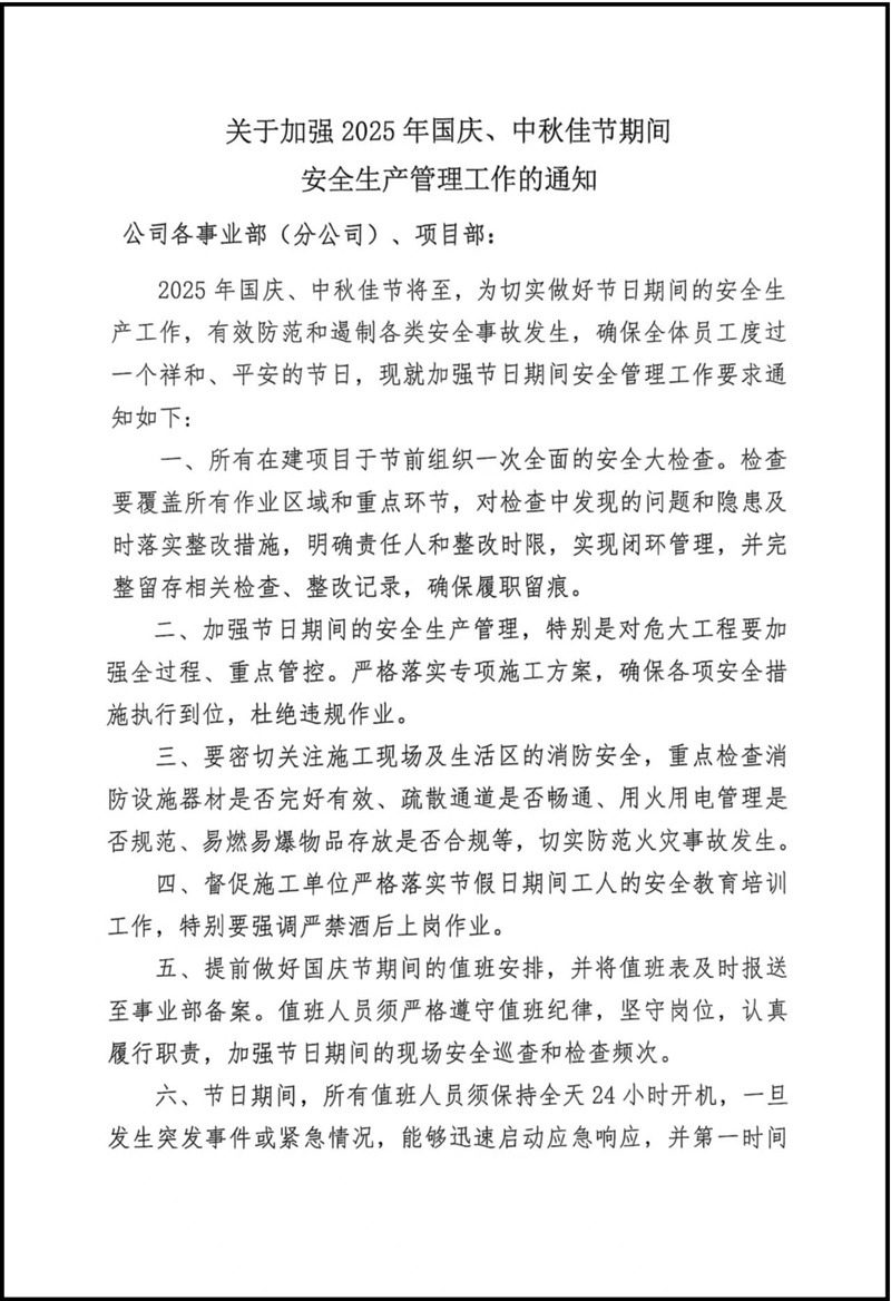 關(guān)于加強(qiáng)2025年國慶、中秋佳節(jié)期間安全生產(chǎn)管理工作的通知